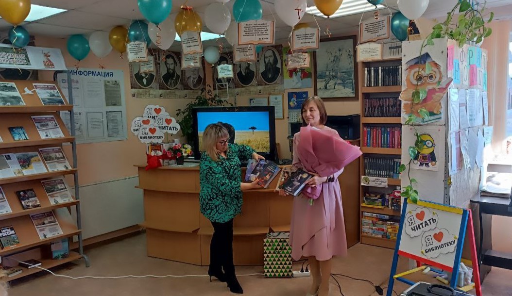 Методист Централизованной библиотечной системы Любовь Пономарева вручила поздравительный адрес от директора Межпоселенческой Централизованной Библиотечной Системы Елены Владимировны Сойновой и передала в дар библиотеке ценный подарок ‒ коллекцию произведений классической литературы, отметив: "Эти книги станут мостом между поколениями читателей".